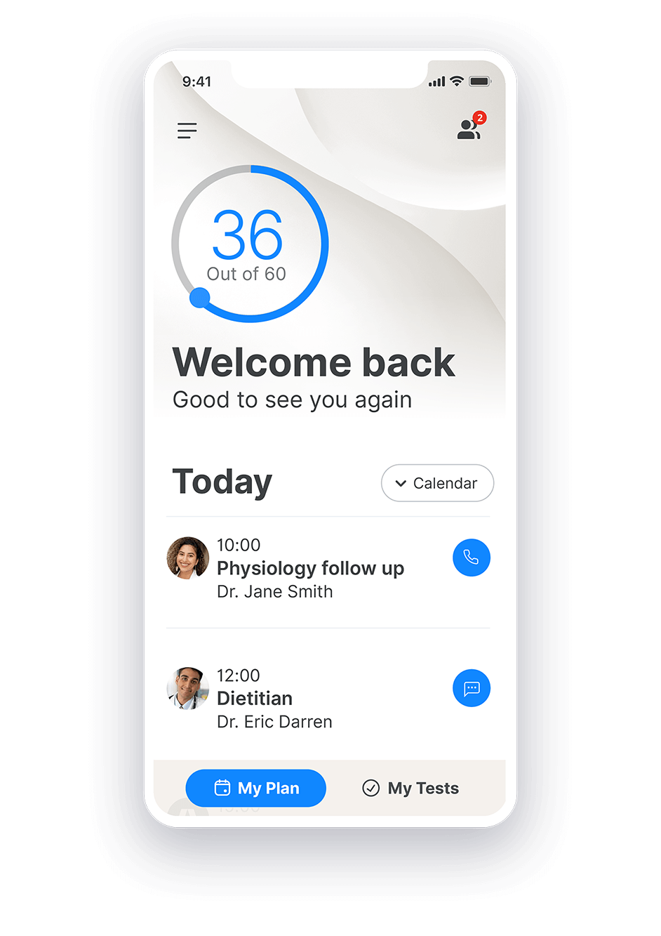 اطلع على نتائج تقييم مركز التميّز الذهني والبدني الخاص بك، والتقارير ومستوى يقدمك باستخدام أي من أجهزتك الخاصة عبر تطبيق مركز التميّز الذهني والبدني. بإمكانك التواصل مع فريق الرعاية الصحية في مركز التميّز الذهني والبدني طوال فترة العلاج، بالإضافة إلى تحديد المواعيد، كل ذلك بسهولة وبين يديك.